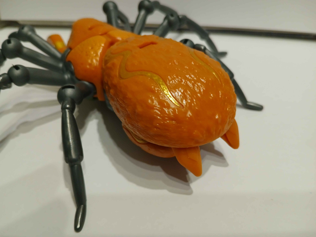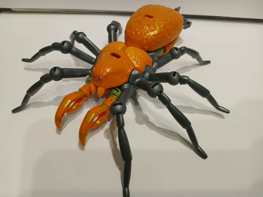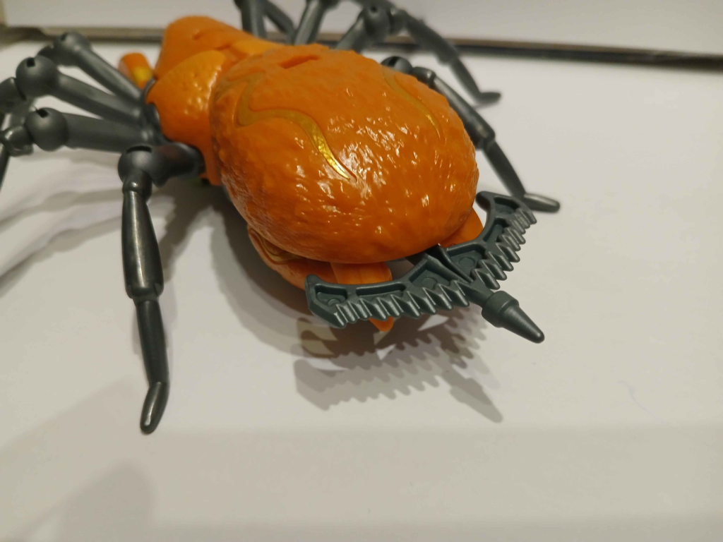 Now, his alt mode… WOW it looks great. I love tarantulas and this looks like a tarantula. I didn’t really think his hands would make very convincing pedipalps but they work just fine for me. But since his legs only have 1 point of articulation in the middle, and none at all at the base, you can’t really pose him doing anything other than just sitting there but… c’mon… have you ever seen a spider? That’s all they do. Especially tarantulas. His buzzsaw stores on the bottom and his gun-thing stores in his ass